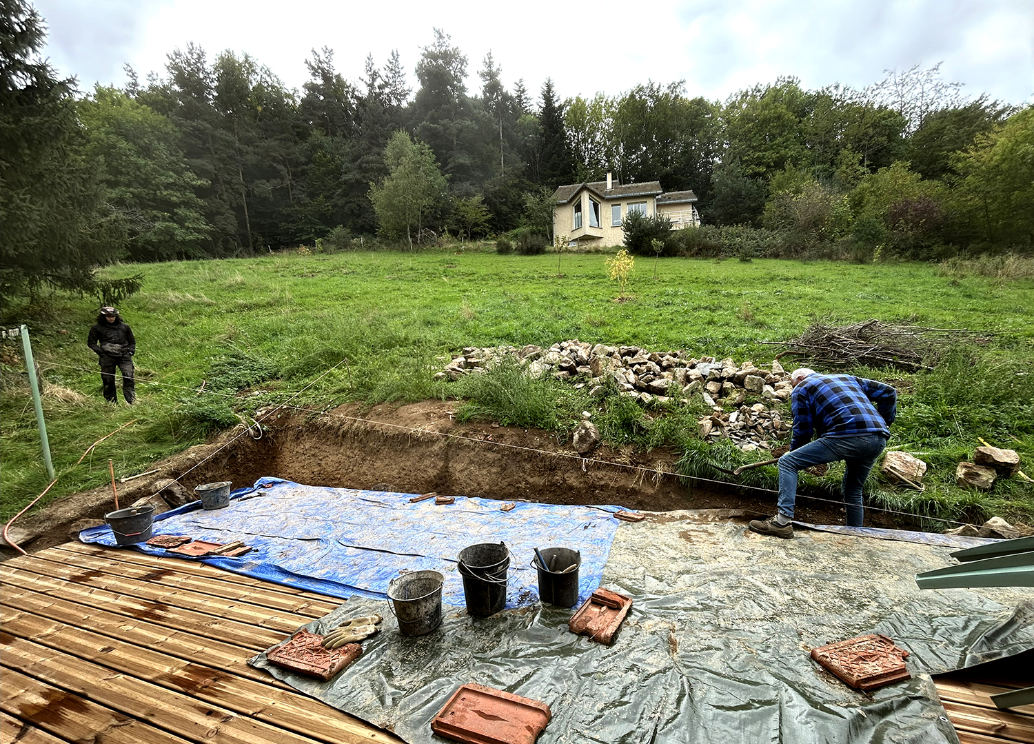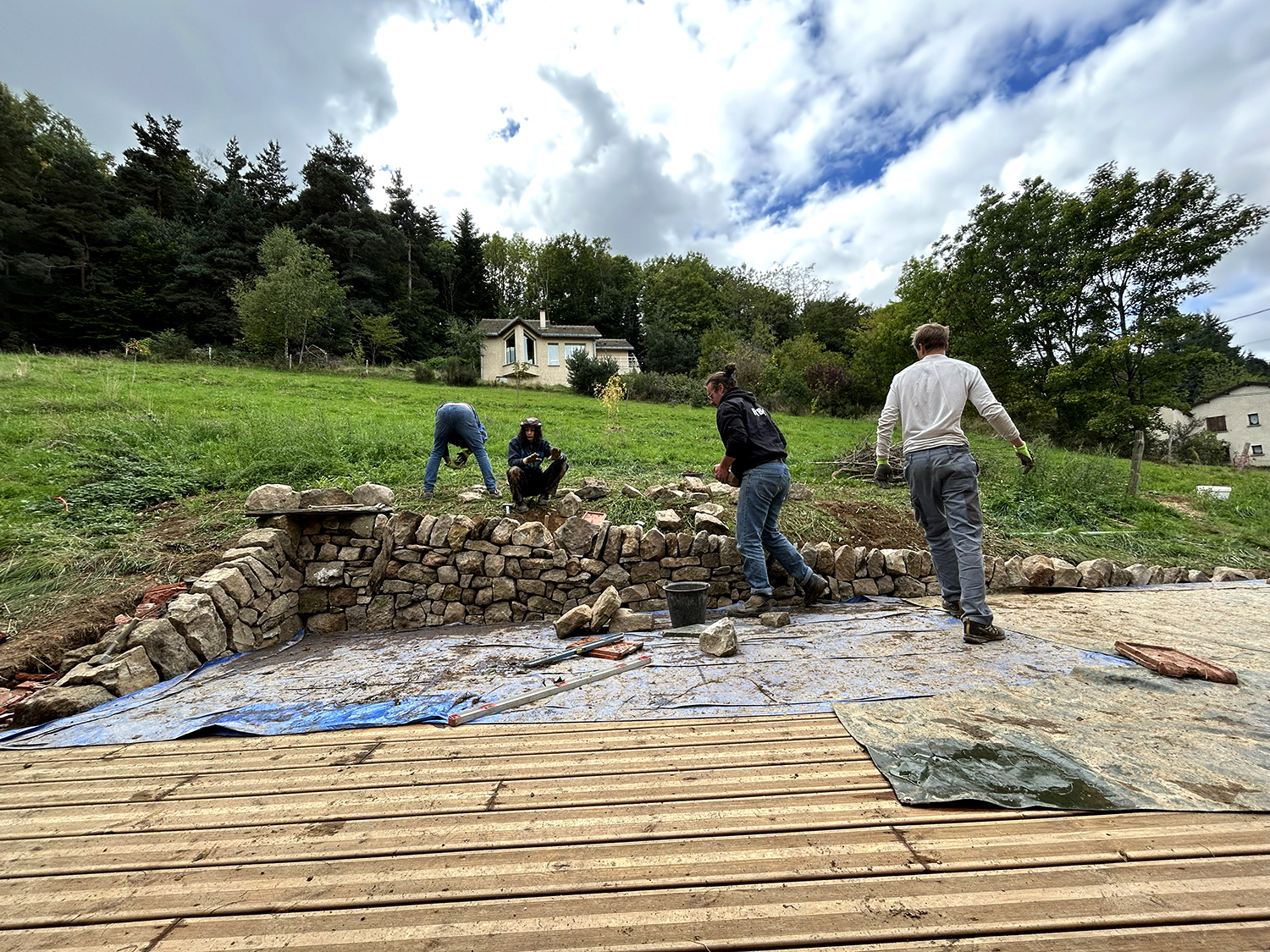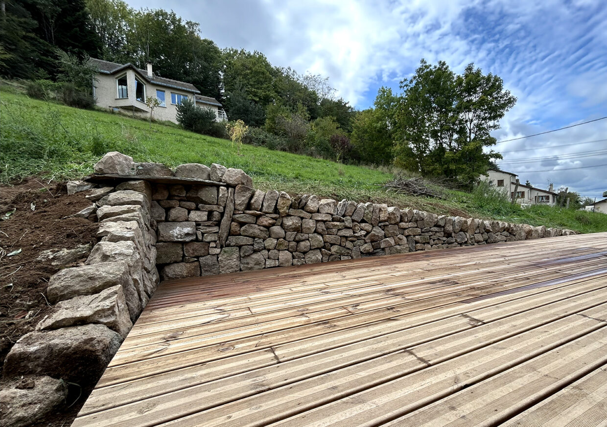 Réalisation d’un petit muret de soutènement en pierres de récupération de Saint-Etienne-Lardeyrol : de l’arkose, un grès local. On interviens aussi chez vous, dans votre jardin, pour réaliser vos idées pierre sèche.