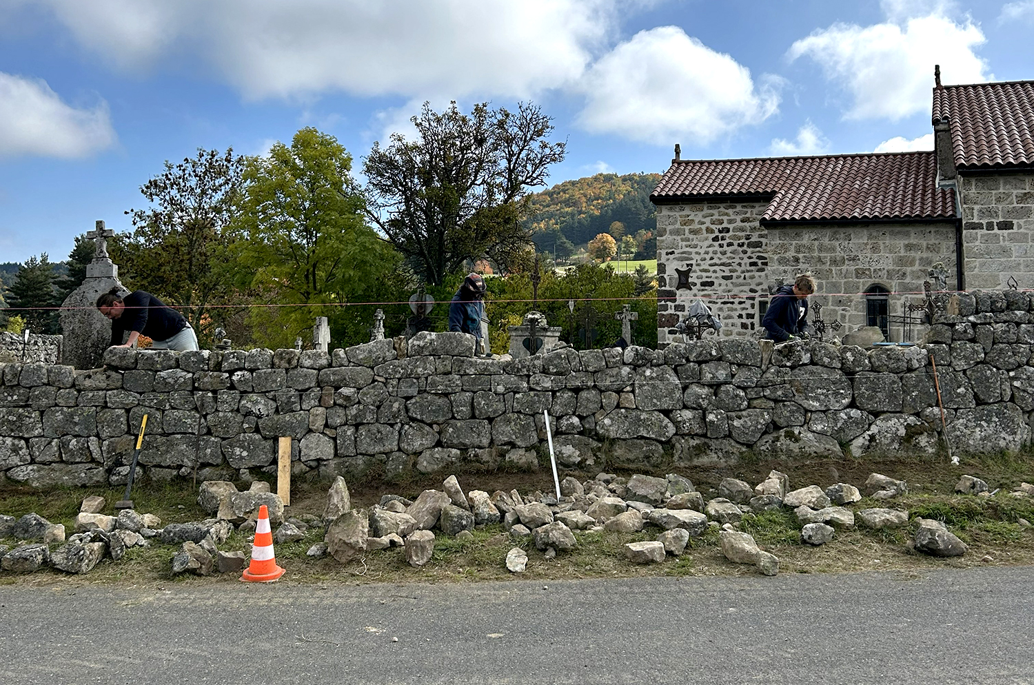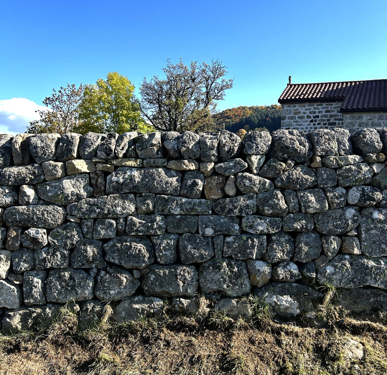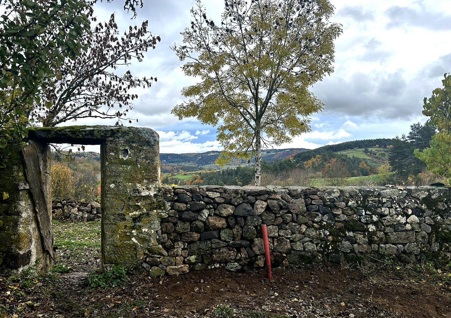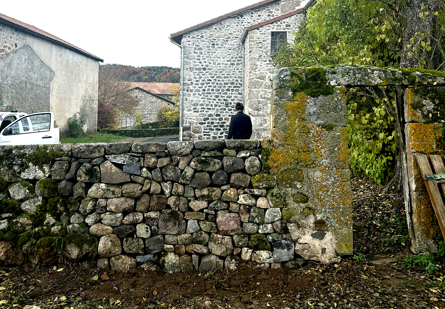 Nous avons eu la chance de restaurer ce mur d’enceinte d’un ancien cimetière avec les pierres existantes (un granit local) et quelques pierres de la ressourcerie de la commune de Lafarre. On a restitué l’ouvrage pierre sèche au plus proche de l’existant, en prenant soin de préserver le paysage de ce lieu historique. Encore un petit patrimoine préservé !