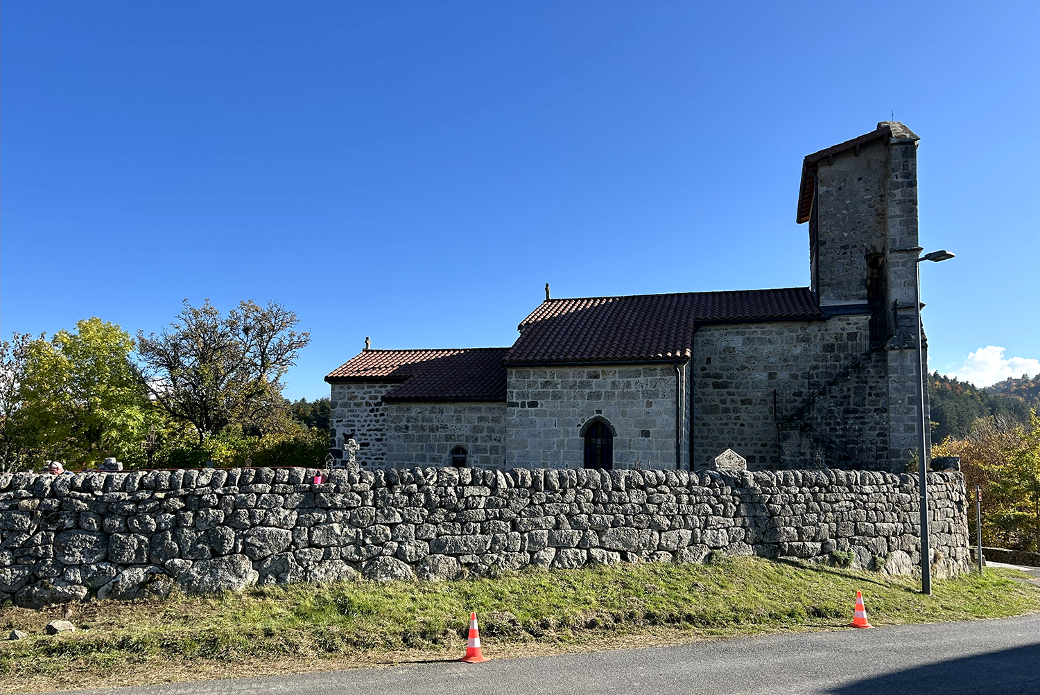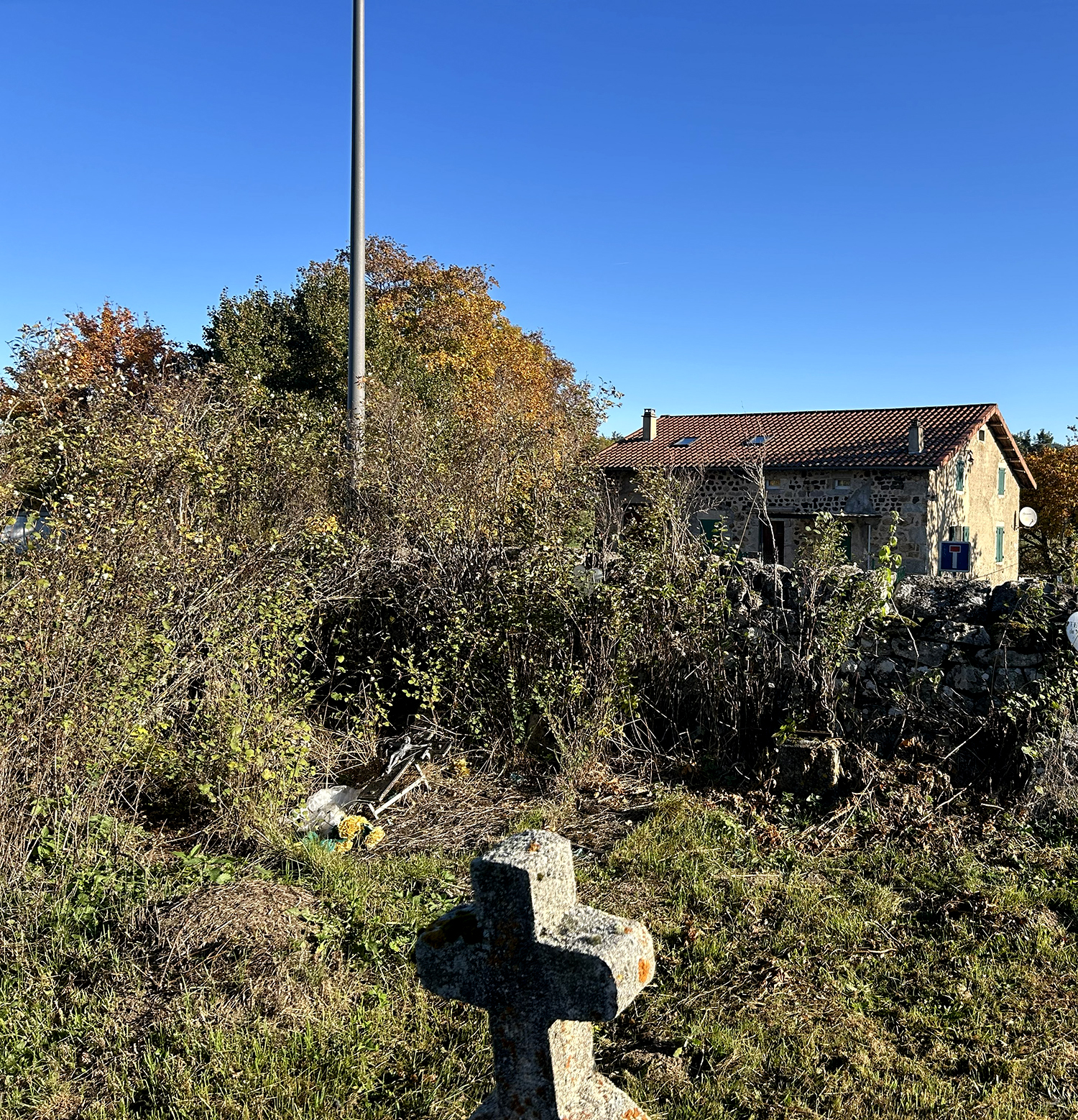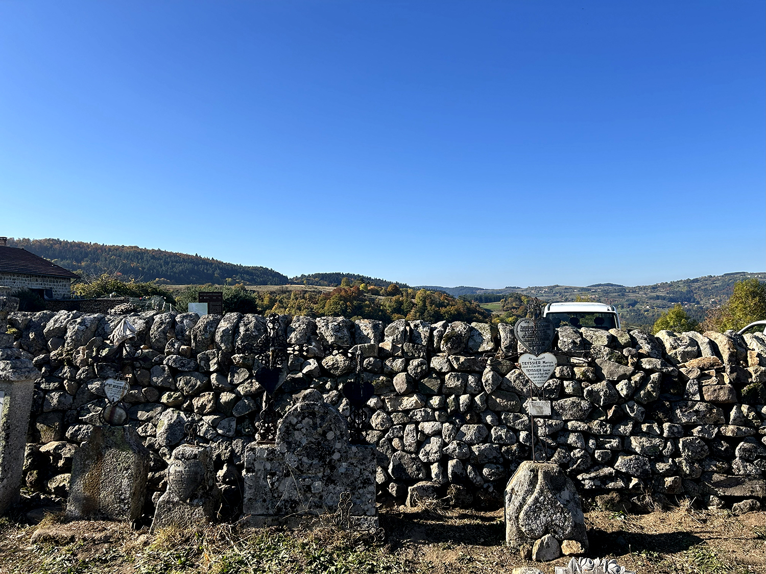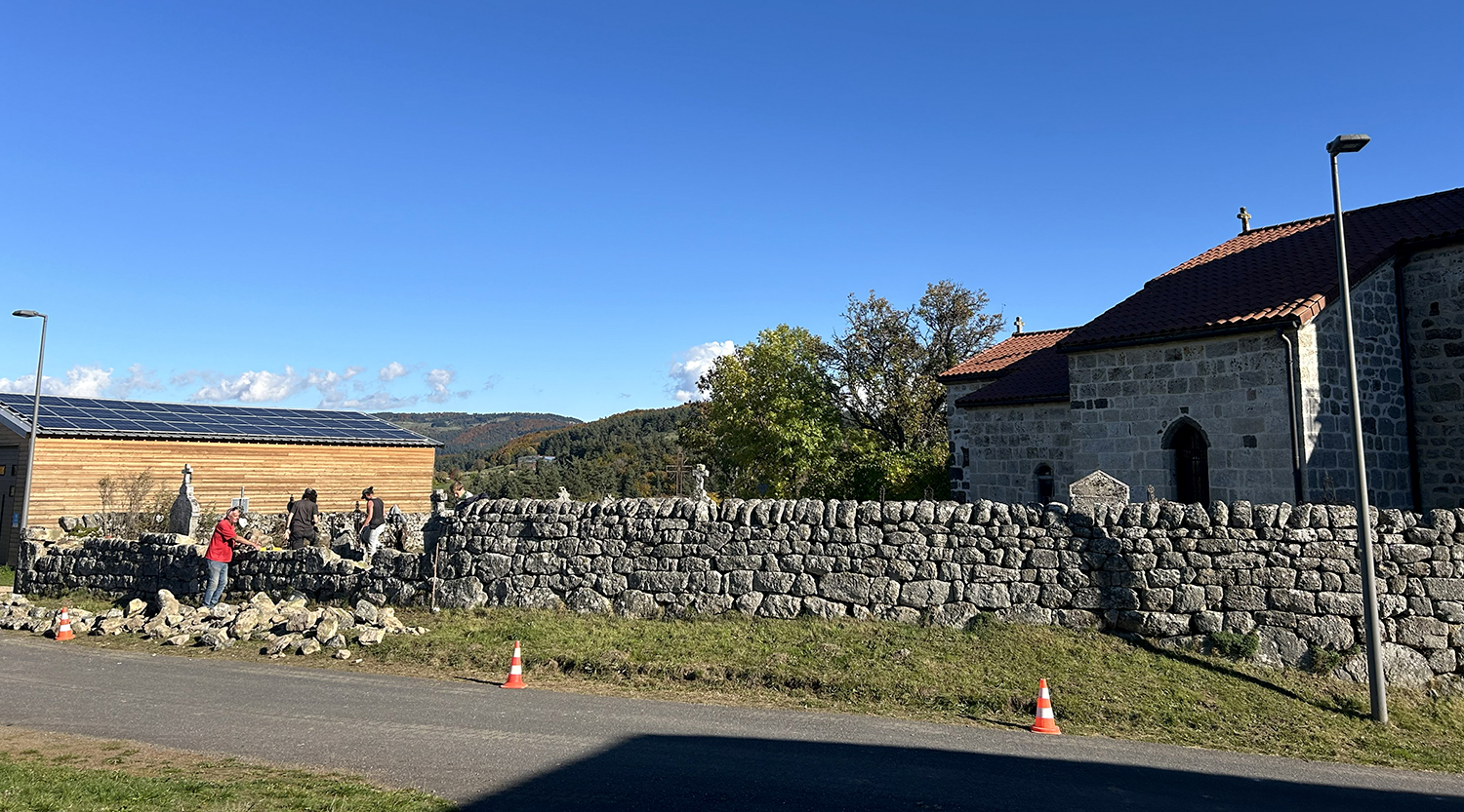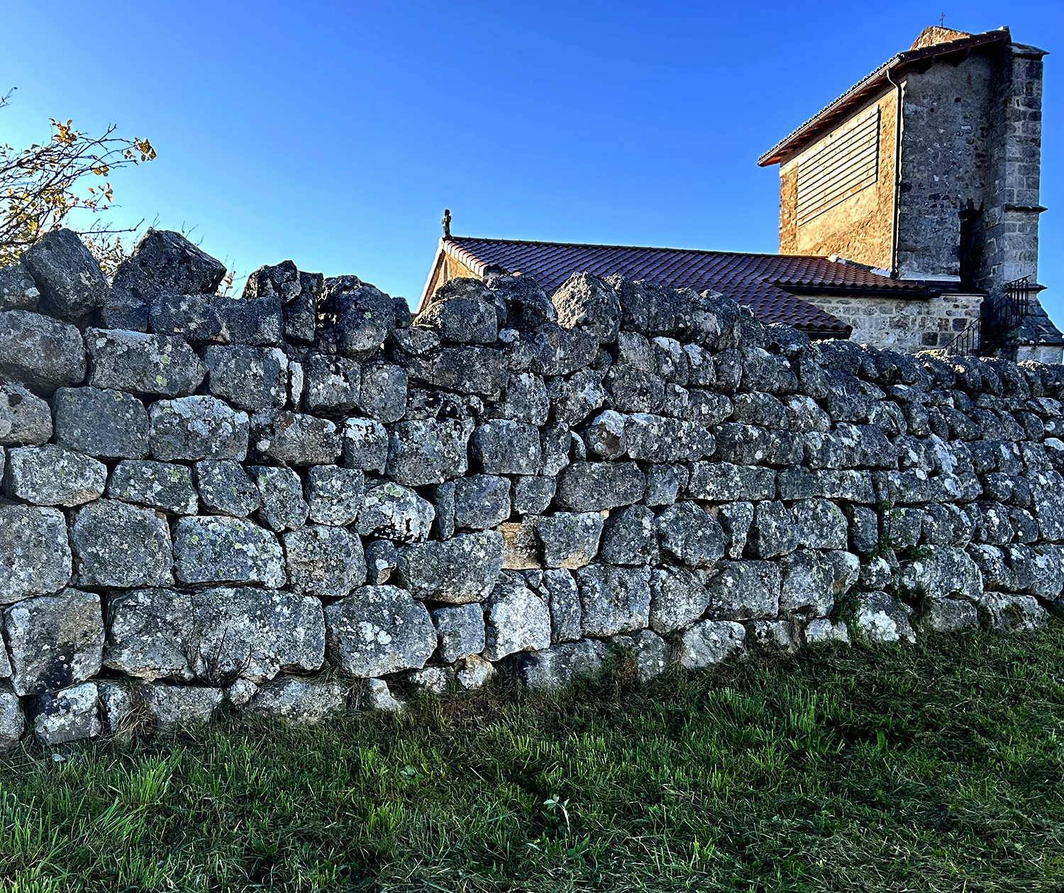 Nous avons eu la chance de restaurer ce mur d’enceinte d’un ancien cimetière avec les pierres existantes (un granit local) et quelques pierres de la ressourcerie de la commune de Lafarre. On a restitué l’ouvrage pierre sèche au plus proche de l’existant, en prenant soin de préserver le paysage de ce lieu historique. Encore un petit patrimoine préservé !